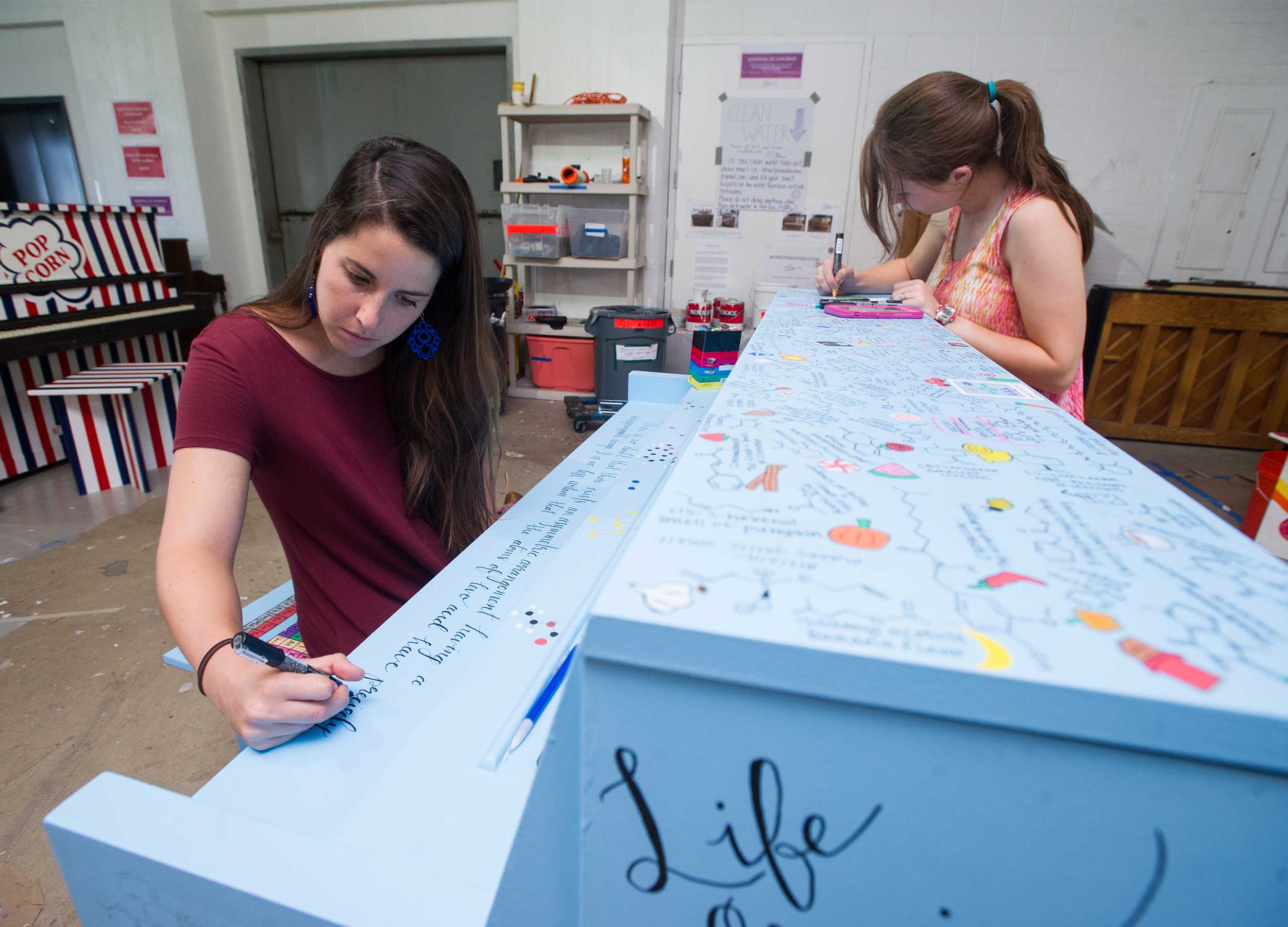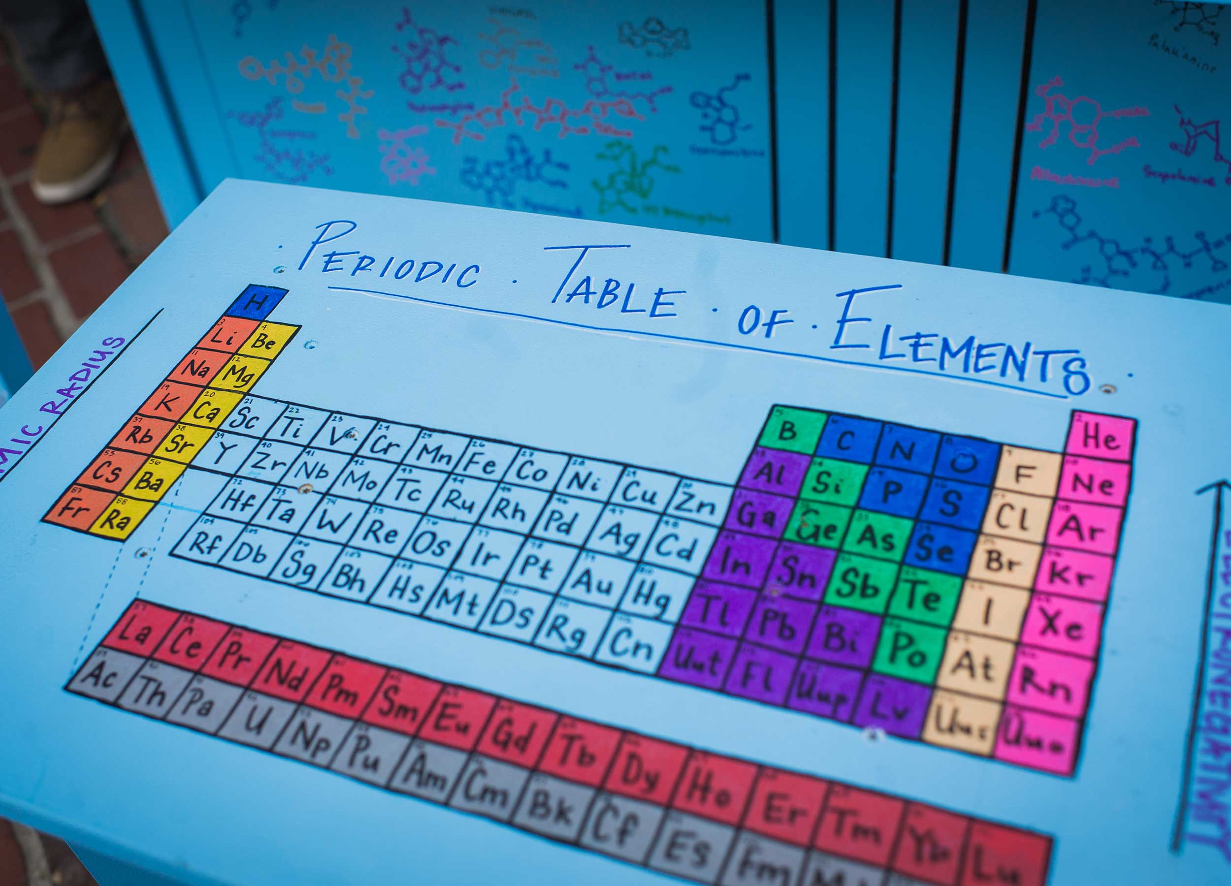 Gabrielle Fleming (GRS’19) and Alexis Courtney Young (GRS’16,’18) painted the bulk of the piano, covering its top with the chemical structures of molecules submitted by their friends and family, other students, and the public. Caffeine was a popular submission, as was capsaicin, which makes peppers spicy. Strontium carbonate, used in red fireworks, and eucalyptol, found in eucalyptus leaves, also made it onto the piano.