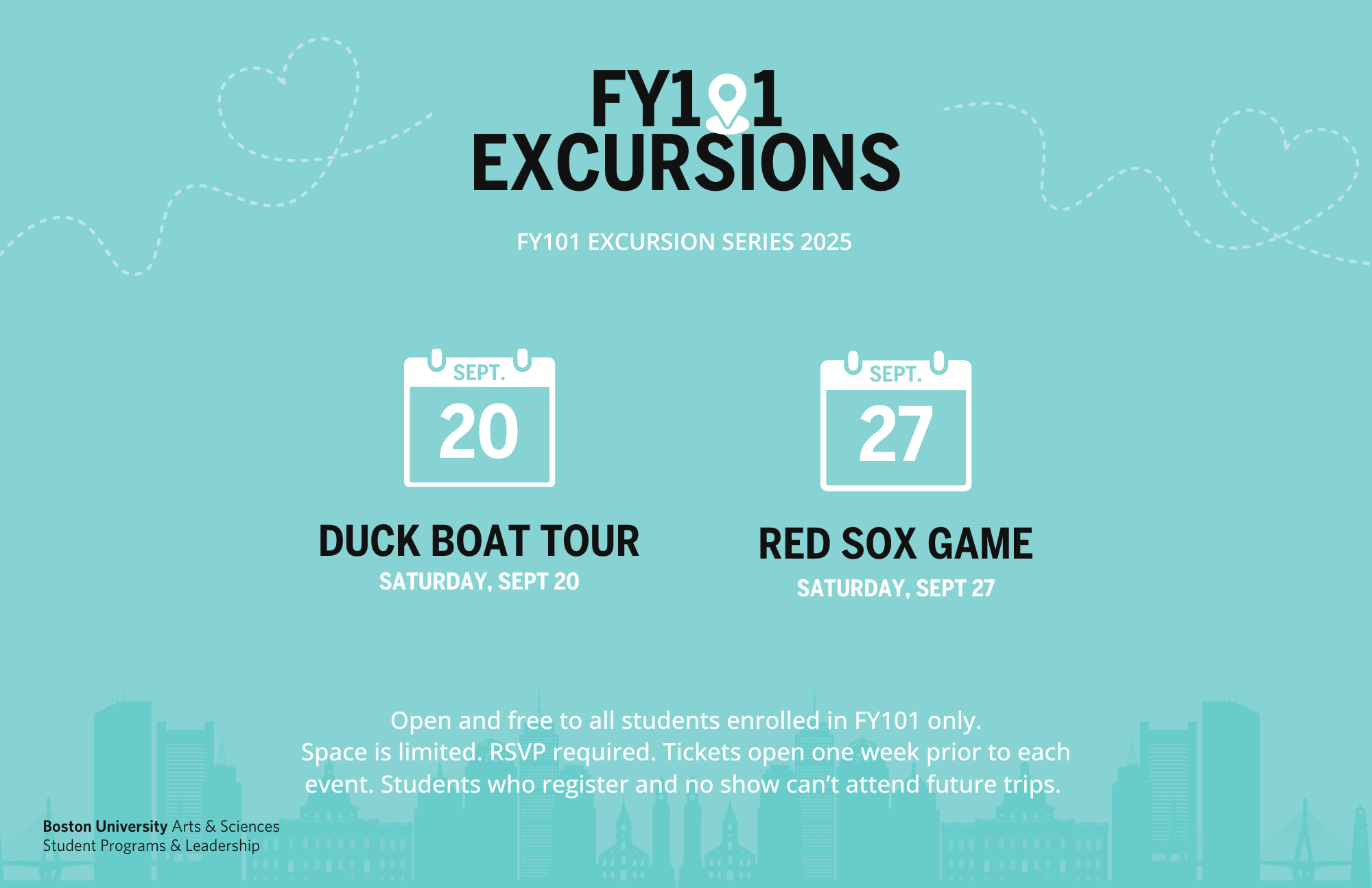 Open and free to all students enrolled in FY101 only. Space is limited. RSVP required. Tickets open one week prior to each event. Students who register and no show can’t attend future trips.