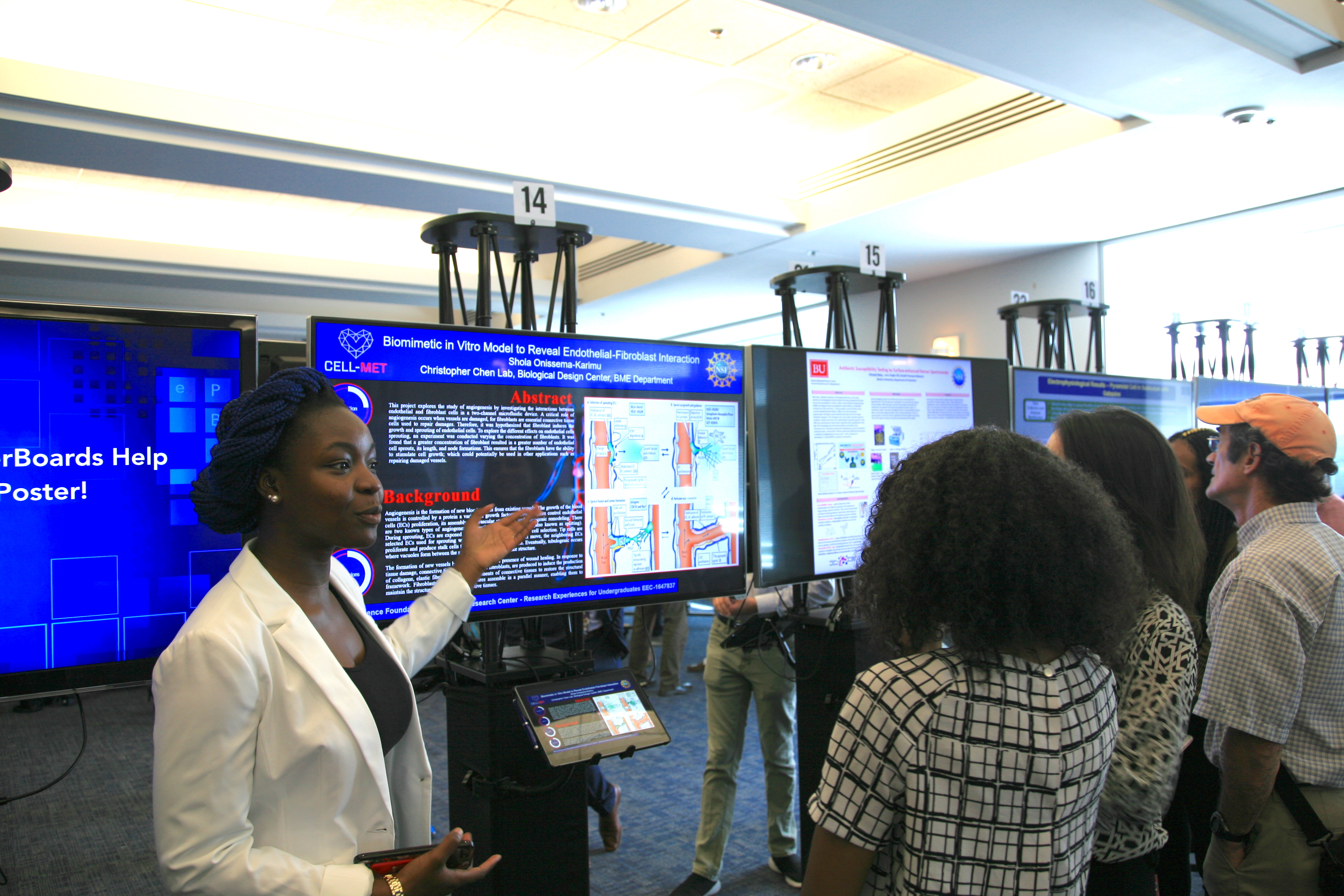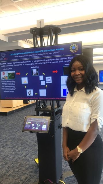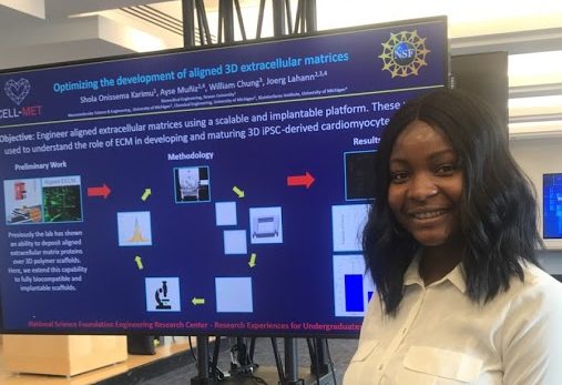 Shola Onissema-Karimu was a CELL-MET REU for two years. First she worked in the Chen Lab focusing on vasculogenesis, or the growth of blood vessels. The following summer, she was a REU participant at the Lahann Lab at the University of Michigan where she demonstrated the ability to produce alignment in engineered ECMs using novel polymer support structures and establish a pipeline for the characterization of the scaffolds.