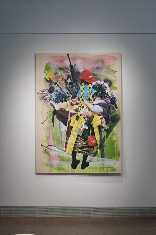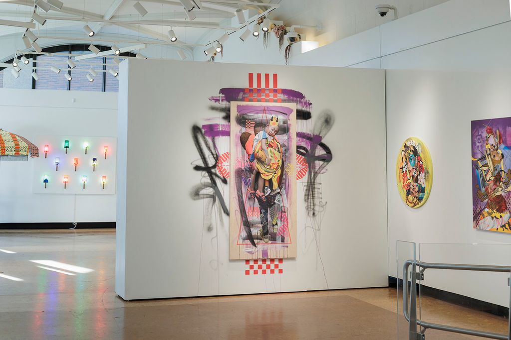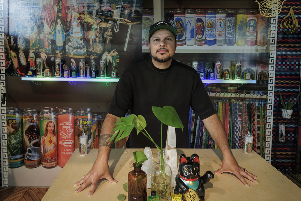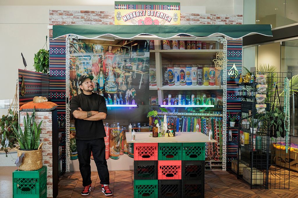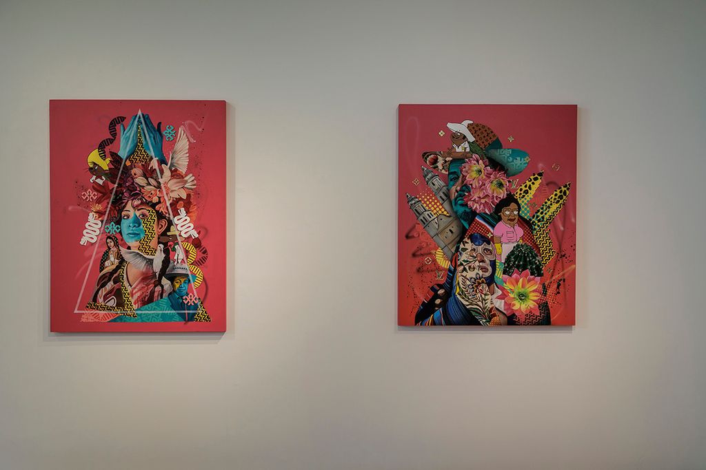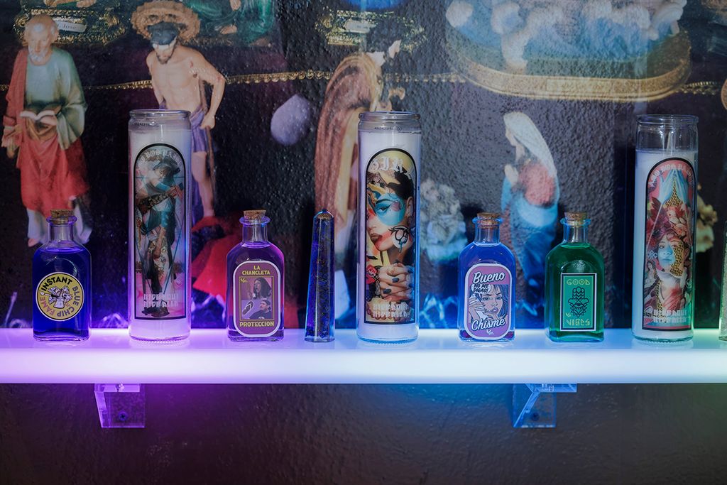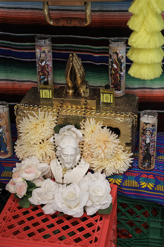 The works on view include over a dozen original paintings that combine acrylic, oil, and custom textiles, with embellishments painted directly onto the gallery walls extending the artwork beyond the frame and into the space itself. A central immersive installation transforms the gallery into a reimagined botánica; part spiritual sanctuary, part neighborhood store featuring altars and shrines constructed from cultural textiles, flowers, devotional objects, and everyday items reimagined through an artistic lens, including repurposed coolers. Evoking the Latinx spaces where healing, ritual, and commerce converge, this faux botánica blends the sacred and the street to honor resilience, memory, and community.