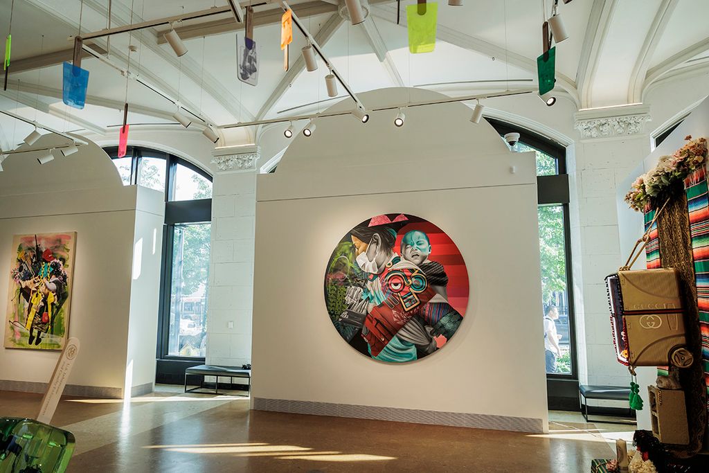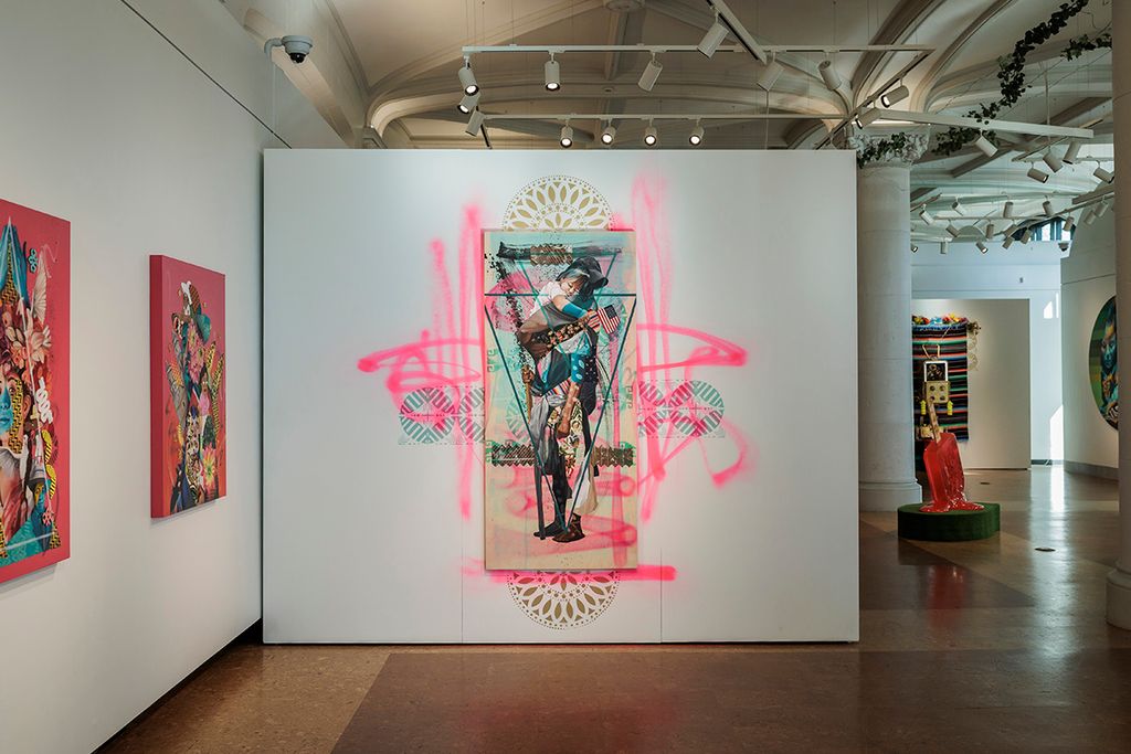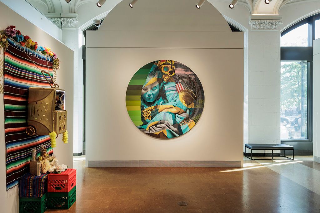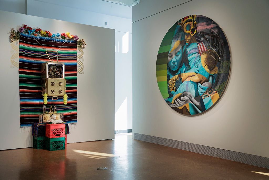 At the center of Ni de Aquí, Ni de Allá is a deep exploration of identity shaped by immigration, incarceration, and resilience. The artist’s signature “Neo Indigenous” style merges graffiti, hip-hop, and Chicanx aesthetics with the visual languages of Mexican and Indigenous tradition. Handwoven rugs and cultural textiles appear throughout the exhibition not only as adornment, but as storytelling devices. They are embedded into paintings, draped over sculptural objects, and woven into immersive shrines, serving as both aesthetic and spiritual anchors. In elevating these materials, Quiñonez honors ancestral memory while reclaiming public space for voices too often erased. For visitors, this exhibition offers both sanctuary and provocation, challenging viewers to reflect on the humanitarian and social issues shaping the immigrant experience and inspiring a sense of pride, empathy, and action.
