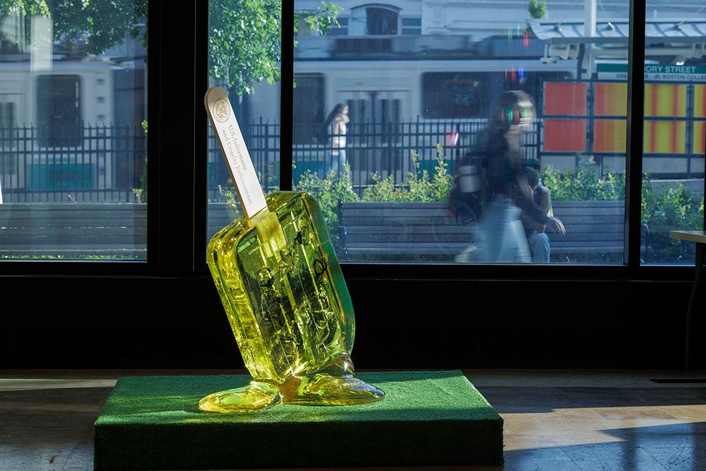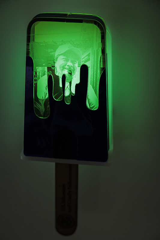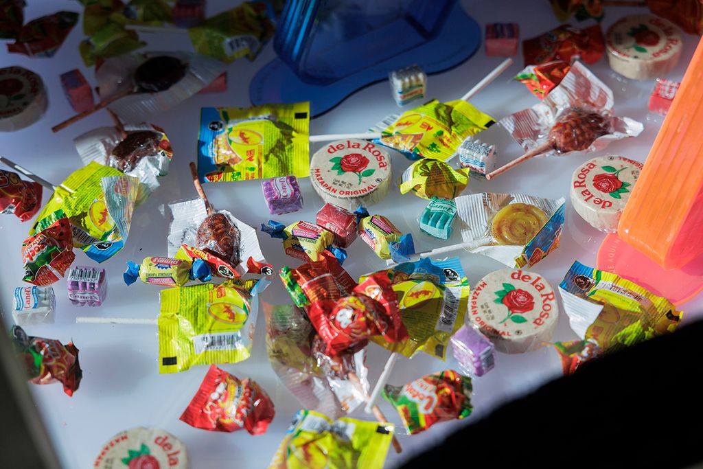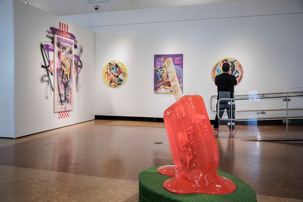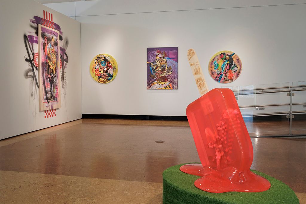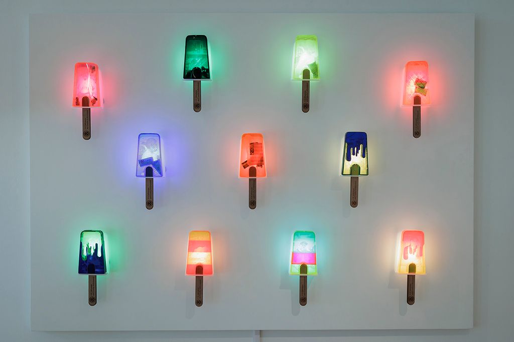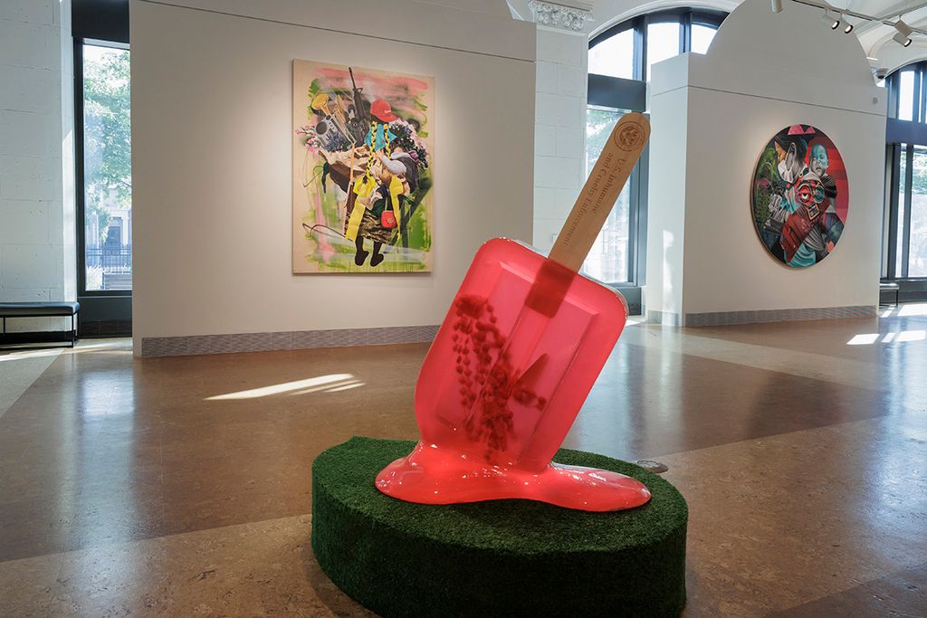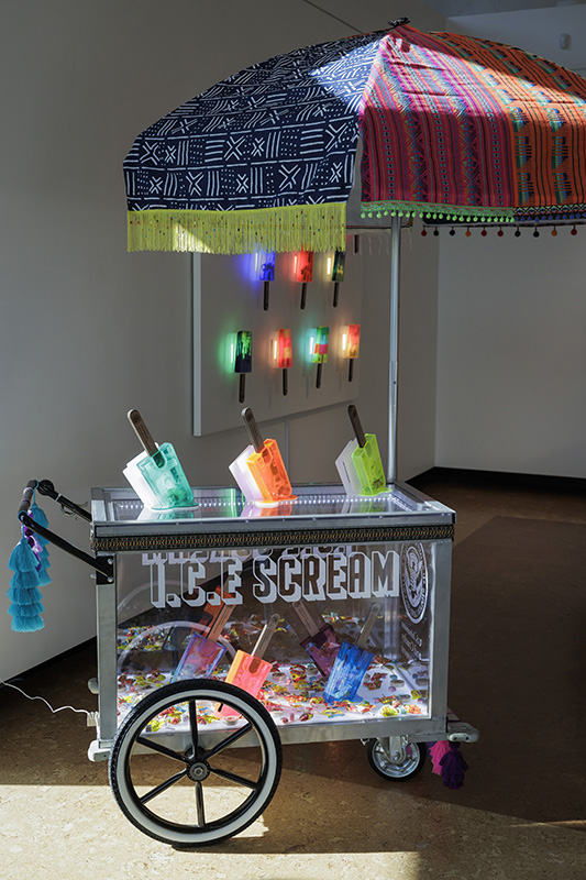 Additional sculptural works include reimagined paleta (ice cream) carts and large-scale resin paleta sculptures, including a dramatic hanging chandelier crafted from faux acrylic Mexican popsicles.
