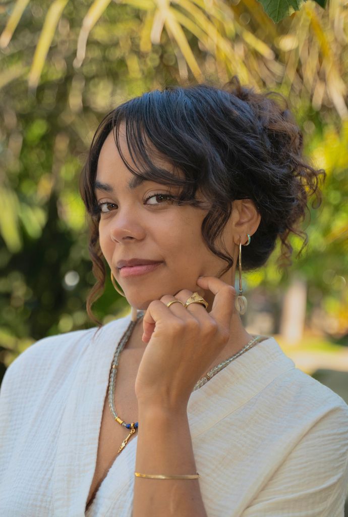 A person wearing a gold and cream patterned outfit poses against a bright yellow background, holding a stringed musical instrument with golden accents. The individual has braided hair styled neatly and looks confidently toward the camera, creating a vibrant and artistic composition.