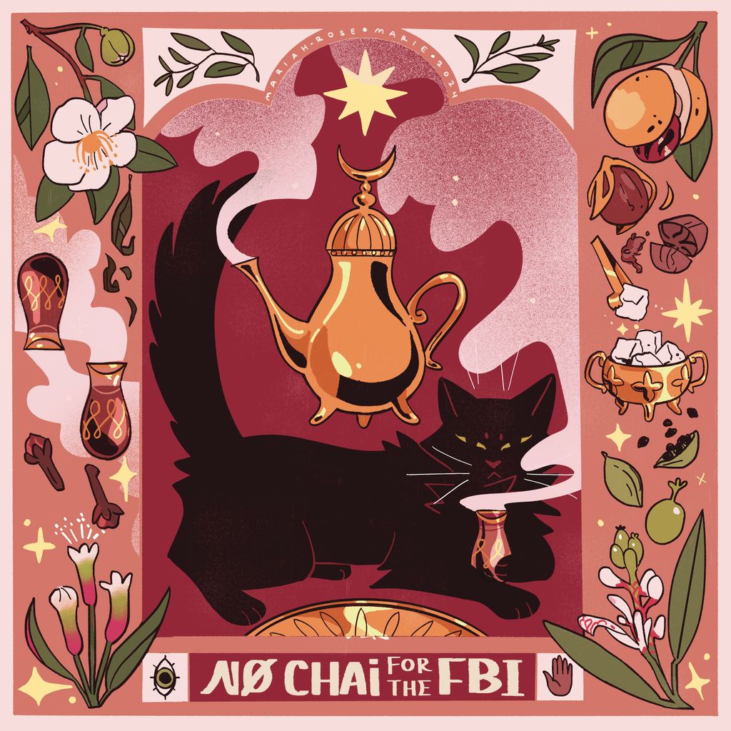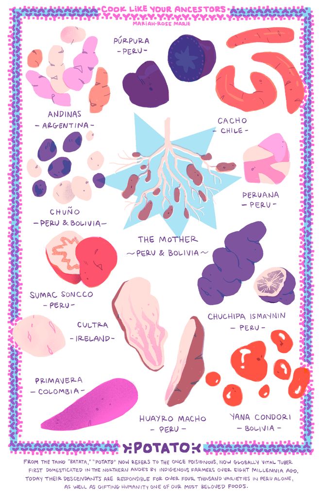 Top row: COOK LIKE YOUR ANCESTORS, 2023. Middle row (left to right): Ode to the Andes (Potato), 2024;  COOK LIKE YOUR ANCESTORS postcard, Ode to the Andes (Tomato). Bottom row (left to right): Family Ties, 2022; No Chai for the FBI, 2024