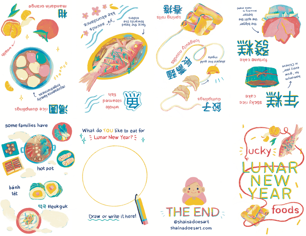 The exhibition features works from our visiting artists, Shaina Lu (Noodle & Bao) and Mariah-Rose Marie (COOK LIKE YOUR ANCESTORS). The works on view highlight the theme of the Drawn Together residency: cultural preservation through storytelling and collective care as resistance.