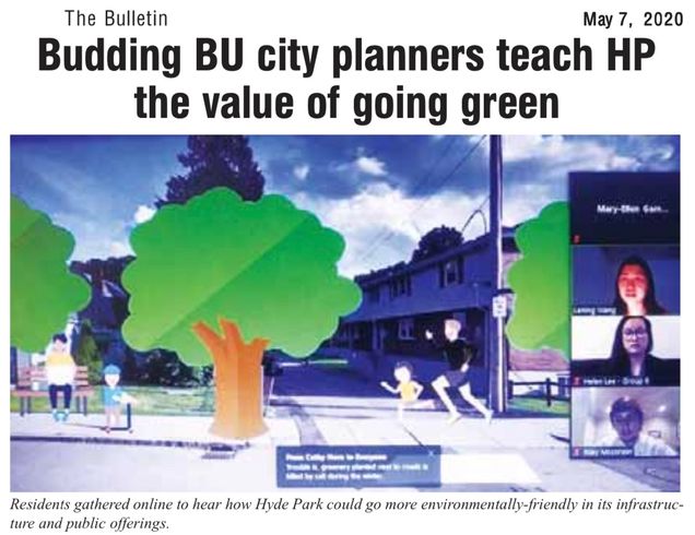 As reported in the Hyde Park Bulletin (Volume 19, Issue 19), on May 5 students from Metropolitan College’s Urban Studies Capstone course (MET UA 805) presented The Power of Green! Strategic Proposals for the Hyde Park Community. The virtual event focused on actions that could be taken to enhance access to, and quality of, the neighborhood’s green spaces, and provoke economic development in the Hyde Park central business district. The four proposals will be made available to the public.