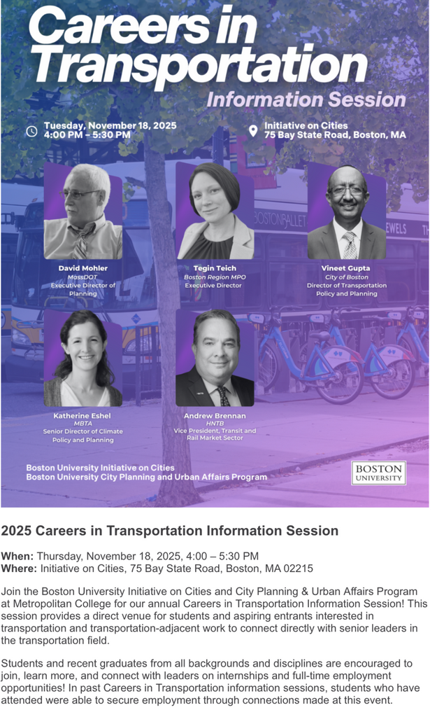 Fall 2025- Transportation in the City Series co-hosted with the BU Initiative on Cities: