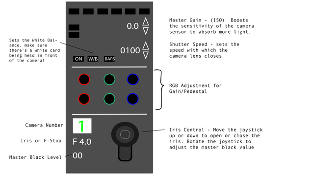 Studio East is our Film and TV studio equipped with three cameras. All three cameras must be controlled remotely via the Blackmagic board in the control room. The board is located in a tower, and slides out for easy access. Below is a rendering of the board including labels and explanations for how to use it to customize the camera settings.