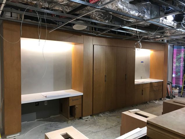 - On the first floor of both the seven-story west and two-story north additions, work on the new walls, ceiling system, and raised seating platforms in the auditorium will continue. Flooring and wall tiling will continue in the two new student and resident lounge bathrooms. Installation of terrazzo flooring will continue in the new student lounge area.