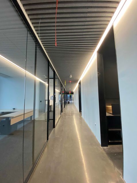 Installation of finishes will continue throughout, including white boards, corner guards, cabinetry, wood and acoustical ceilings, interior glass walls, doors, final paint, polishing concrete floors, office carpet, and plumbing fixtures.
