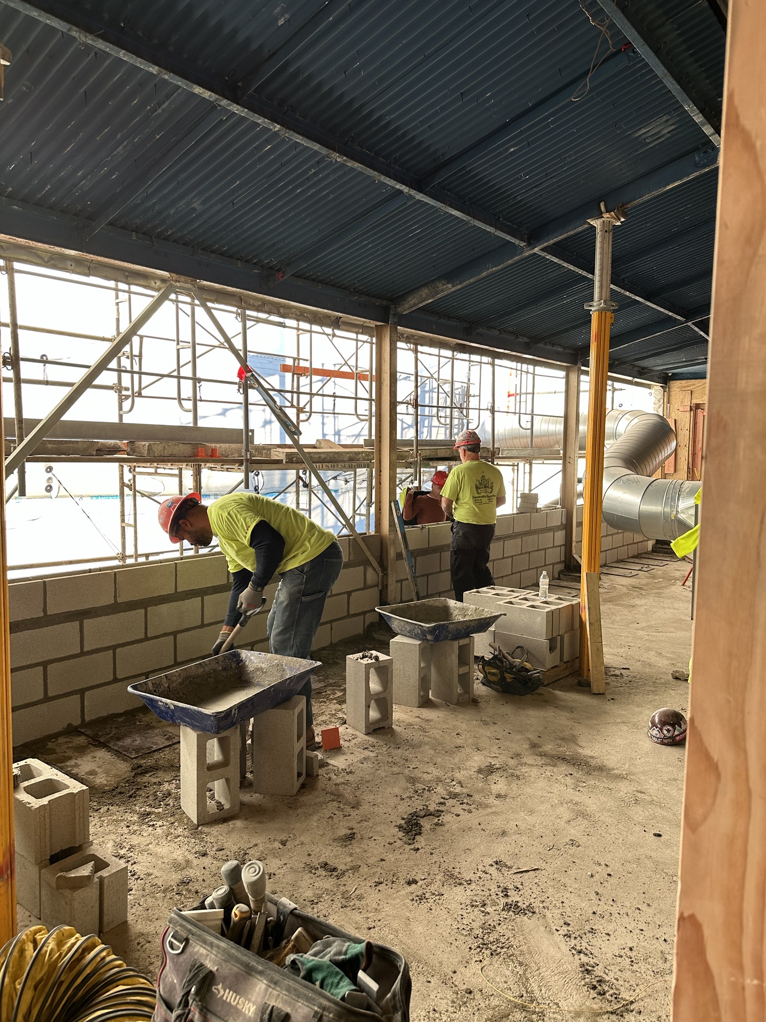 Masons continue with masonry backup repairs on the level 8 façade in preparation for brick rebuild. The 8th level is unoccupied.