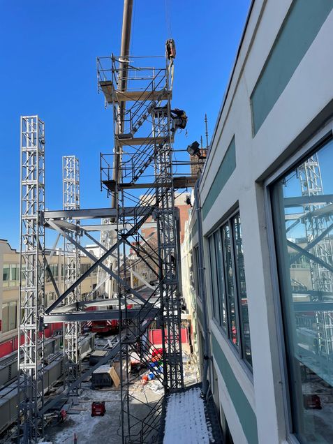 - Crews will continue installing overhead protection, shoring towers, and scaffolding at the rear alley behind the building.