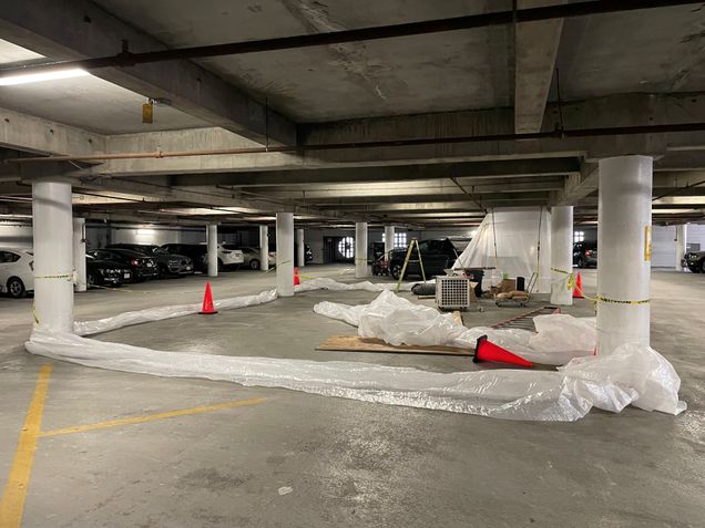 - Crews will be waterproofing a section of the concrete floor on the 2nd level of the parking garage.