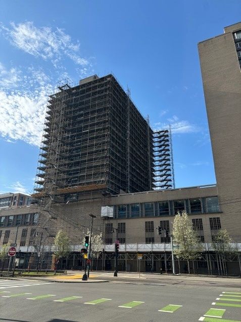 - Crews will continue assembling the staging upward, feeding materials from the laydown areas on the low roofs (east and west of Tower A) adjacent to student rooms. For privacy, please keep blinds, drapes, and window treatments closed.