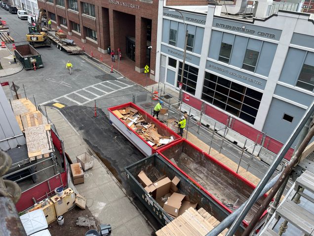 - Crews will continue abatement demolition on the west terrace. Crews will utilize a crane to hoist demolition debris down to dumpsters, which will be located on the west side of Cummington Mall.