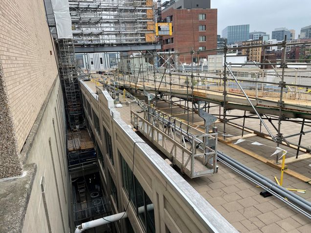 - Crews will work from swing staging to create openings in the brick veneer to install staging tie backs.