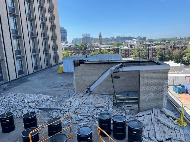 - Crews will continue abatement demolition on the west terrace. Crews will utilize a crane to hoist demolition debris down to dumpsters, which will be located on the west side of Cummington Mall.
