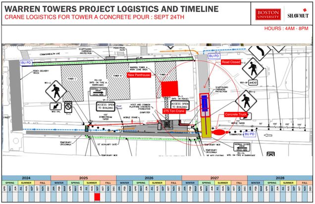 - Crews will conduct reoccurring crane work on Cummington Mall and Hinsdale Mall in the coming weeks.