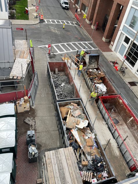 - Demolition is ongoing, debris is loaded into hampers, transported and emptied into dumpsters located in the construction loading dock.