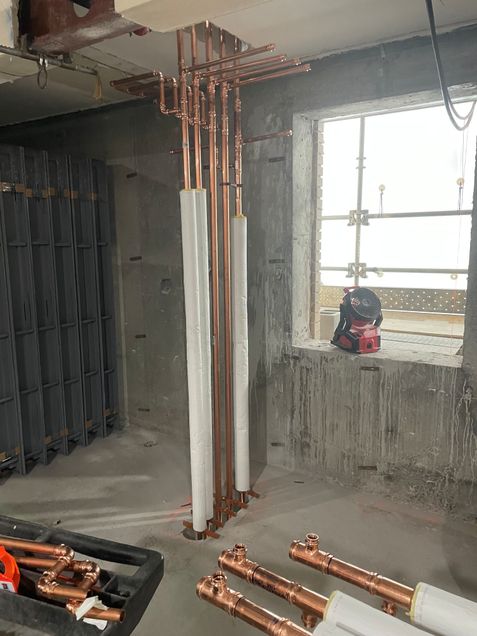 - Plumbers are installing new water and drain lines in the basement, 1st, 2nd, 3rd