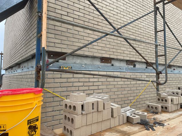 - Masons will continue with exterior brick veneer restoration work, selective demolition, installation of restoration anchors, air water and vapor barriers, new lintels, flashings, and relieving angles.
