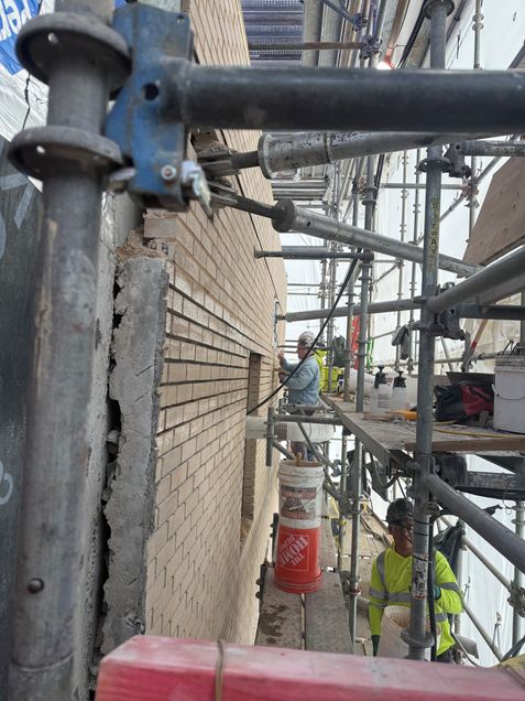 - Masons will continue with exterior brick veneer restoration work, selective demolition, installation of restoration anchors, air water and vapor barriers, new lintels, flashings, and relieving angles.