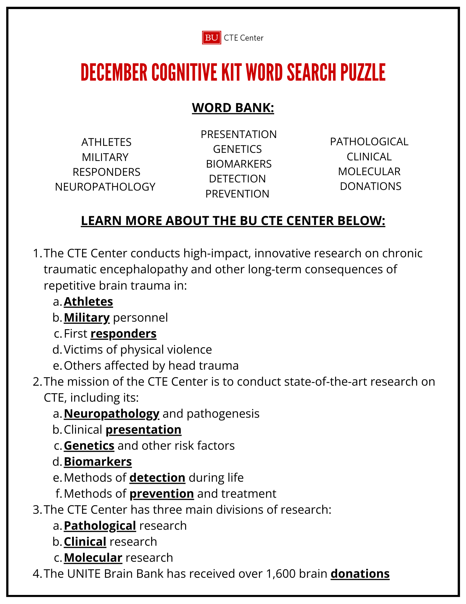 You can download this month’s crossword puzzle/word search here: December 2024 Cognitive Kit Word Search Puzzle