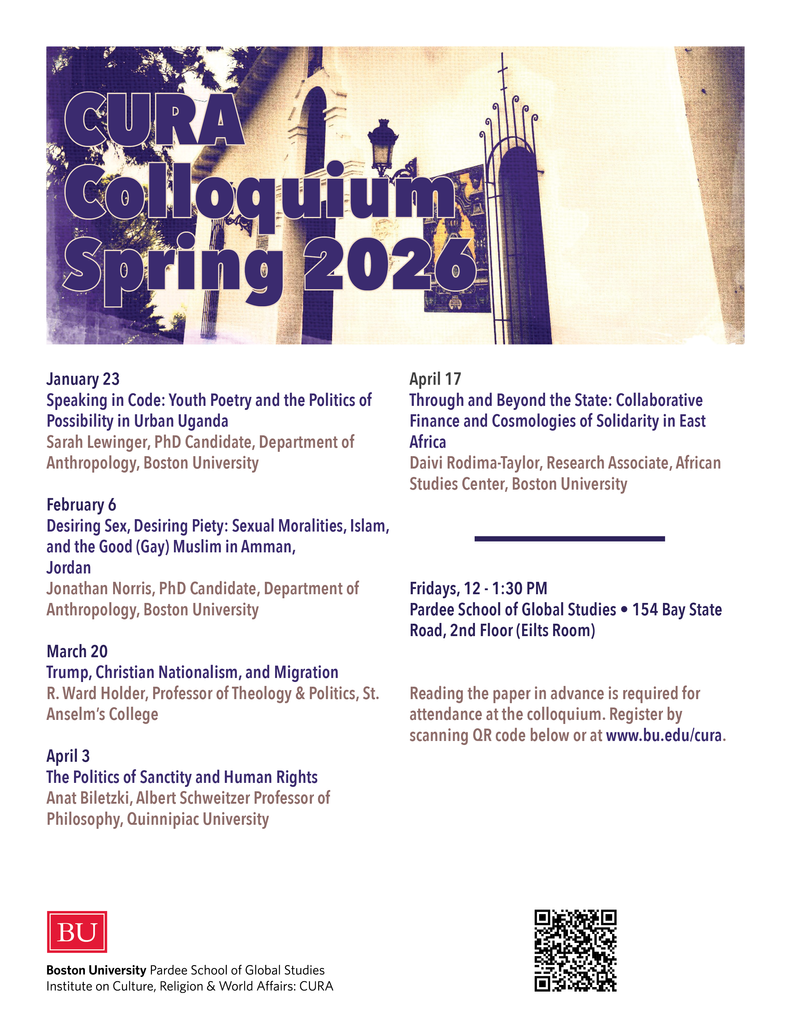 CURA announces the spring 2026 colloquium schedule. This year-long conversation brings together an interdisciplinary community of scholars of culture, religion, and world affairs. Please register below for the session(s) you plan to attend.