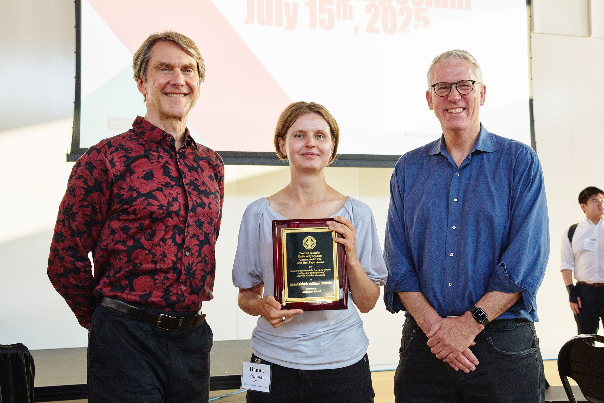 Last week the Digital Business Institute at Questrom School of Business, Boston University sponsored this fantastic event, bringing together global scholars to advance the latest platform research. Day 1 featured a PhD Consortium, by invite only, for instruction by top platform scholars as well as a top editor at Management Science. Day 2 was the main event, featuring great new research on social media algorithms, use of AI to expand platform power, decentralization challenges, M&A strategies, robo taxis, and more. Pictured below: conference co-chair Marshall Van Alstyne, 2025 Capgemini best paper award winner Hanna Halaburda, and conference co-chair Geoff Parker.