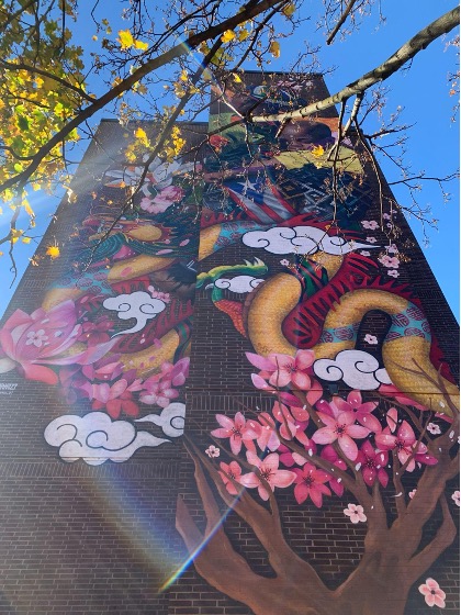Figure 6: 呂明穎 Shaina Lu and 伍綺雲 Yvonne Ng, 千絲萬縷 Tied Together by a Thousand Threads, 2017. Mural on plywood. 20 Harrison Ave, Chinatown, Boston. Photograph by the author.