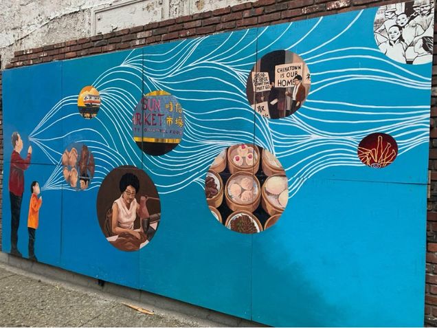 In the context of community-centered (and therefore site-specific) arts, Kwon synthesizes that “site specificity … finds new importance because it supplies distinction of place and uniqueness of locational identity.”[19] López Chavez practices this kind of model, stating that her creative process “is fueled by understanding the context of a site, really taking the time to research and learn about the space, the community, and the wall itself.”[20] What both Kwon and López Chavez are in agreement of is a distinctness of place that is special to the people living there, one not to be confused with sameness. An example of “distinctness of place” is Shaina Lu’s and Yvonne Ng’s 千絲萬縷 (Tied Together by a Thousand Threads), a mural on plywood anchored in Boston’s Chinatown (fig. 6). It depicts a grandpa and a kid blowing strands of stories into the wind. I find the strands reminiscent of that Chinese oral tradition which author and activist Maxine Hong Kingston so fondly refers to as “talk-story.”[21] This mural is quite literally a statement on the importance of community, i.e. the threads that tie us together. It is a reminder of neighbors, friends, and heritage; it is a reminder of Chinese-American immigrant culture and what we stand for, especially in Boston’s Chinatown, a historically redlined district now threatened by displacement from high-rise construction and luxury development.[22]
