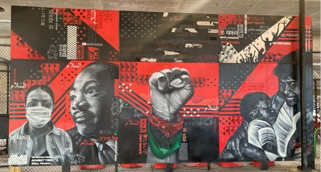 Figure 7: Cey Adams, Sophia Dawson, Victor ‘MARKA27′ Quiñonez, Rob “Problak” Gibbs, Rob Stull, No Weapon Formed Against Thee Shall Prosper, 2020. Murals for the Movement, Museum of Fine Arts, Boston (now located at Underground at Ink Block). Photograph by the author.
