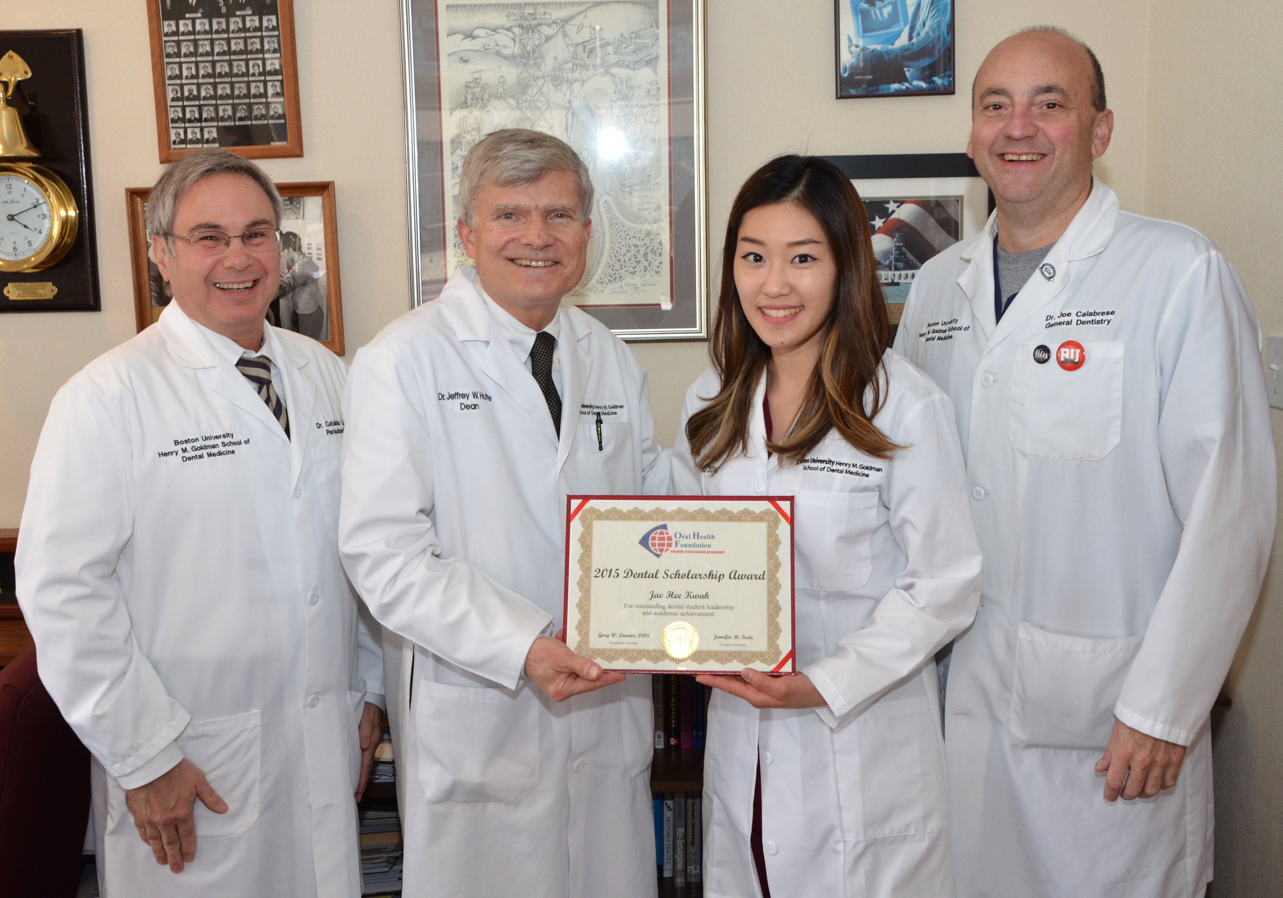 On April 29, 2015, Dean Jeffrey W. Hutter presented Jae Hee Kwak DMD 16 with the Pierre Fauchard Academy’s 2015 Foundation Dental Student Scholarship Award for her leadership and service to Boston University Henry M. Goldman School of Dental Medicine (GSDM). Also present for the ceremony were Associate Dean for Academic Affairs Dr. Cataldo Leone and Assistant Dean of Students Dr. Joseph Calabrese.