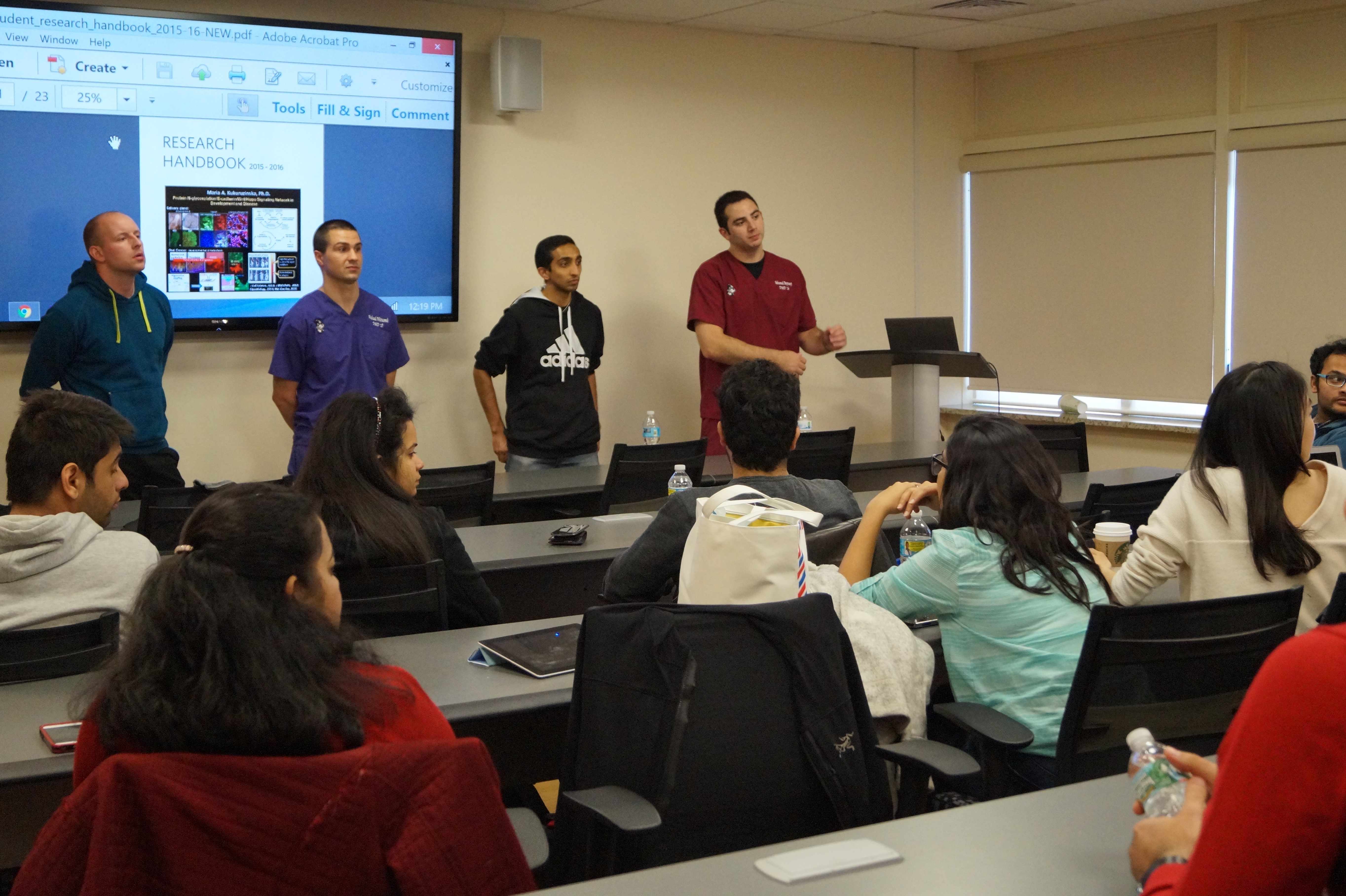 The hour-long Research Fair was run by the SRG officers. The room was packed with pre-doctoral candidates and other students who attended both the presentation and a Q&A session to learn about research opportunities. In addition to discussing the Research Handbook—a useful guide for students interested in research—the student leaders talked about their personal research experiences and fielded questions on a variety of topics, including how to approach a potential research mentor and how to deal with scheduling challenges.