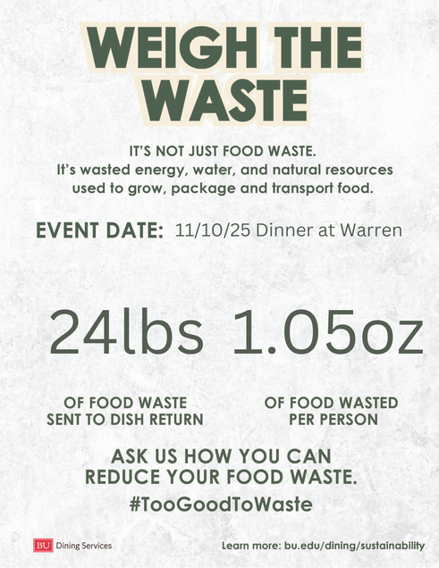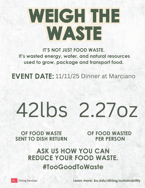 Every day, we take steps to minimize the amount of pre-consumer waste we generate in our kitchens, such adjusting production volumes, cooking to order and in small batches, repurposing leftover ingredients, and retraining knife skills. We use a sophisticated technology called StreamLine to identify and reduce pre-consumer food waste in all dining halls. Real-time data identifies the quantity of the specific food item wasted and sends that information to our menu management platform. With this information, BU Dining strategically adjusts production volumes and purchasing to minmize wasted food, as well as as identifies opportunity areas for knife skills training and creatively repurposing ingredients. Pre-consumer waste can include trim waste, overproduction, expired food, spoiled food, and food wasted because of quality, equipment failure, handling, or catering guarantees. About 2/3 of pre-consumer food waste is inedible trim from produce and meat. Whenever possible, we recover surplus food for donation. We work with three local partners: Food For Free, Rescuing Leftover Cuisine, and BU’s Student Food Rescue program. Between July 2024 and June 2025, we donated nearly 3,200lbs of food – equivalent to more than 2,600 meals – from our residential dining halls, retail locations, and catering operations. Through waste tracking we know that post-consumer waste accounts for about 75% of food waste. BU Dining Zero Waste Guides lead ‘Weigh the Waste’ events in each dining hall throughout the semester. These events not only serve as an opportunity to highlight the collective amount of post-consumer waste generated on campus, but also provide us with valuable information on what foods are being wasted and why so we can implement changes to support waste reduction. Some of the changes we have implemented as a result of these events include: plating every other burger without a bun, offering smaller slices of pizza, removing the default starch from some entrees, and offering lettuce wraps. Over the course of 30 events in AY24/25, the average student generated about 2.1oz of food waste per meal. Since we began holding Weigh the Waste events, we have seen a 50%+ reduction in average edible food waste per person.Pre-Consumer Waste