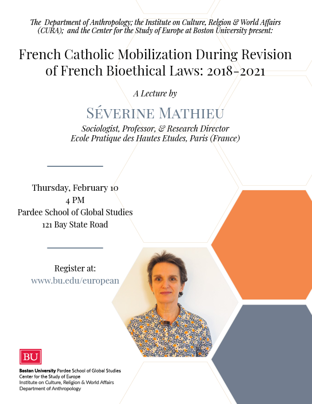 Join us at the Pardee School on Thursday, February 10, at 4 PM, for our a lecture on “French Catholic Mobilization During Revision of French Bioethical Laws: 2018-2021” by bu Séverine Mathieu. This event takes place as part of the Department of Anthropology’s Seminar Series and is co-sponsored by the Institute on Religion, Culture, and World Affairs (CURA) and the Center for the Study of Europe.