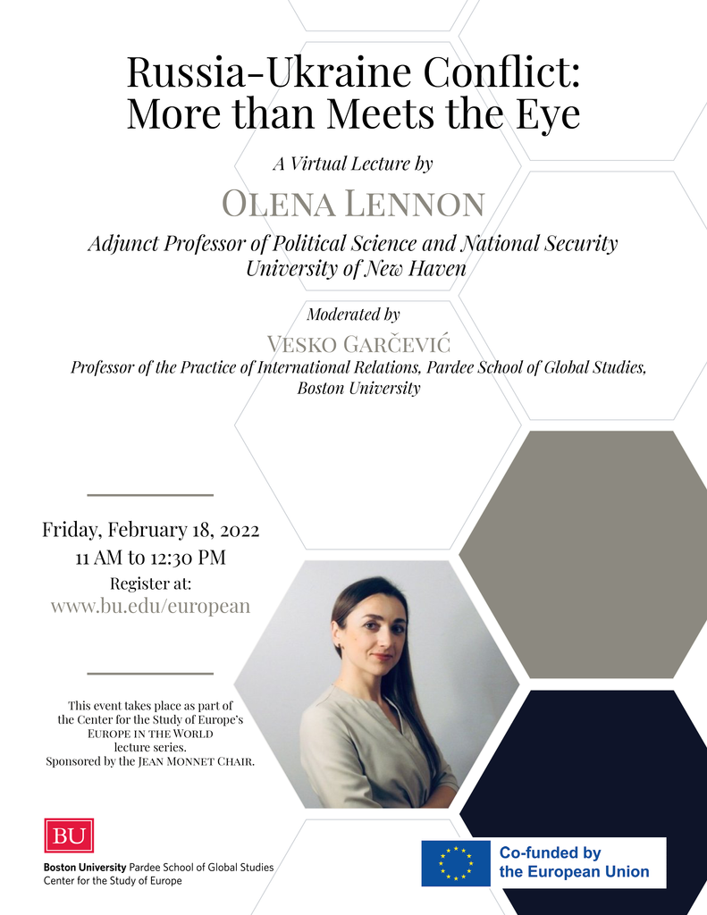 Join us via Zoom on Friday, February 18 at 11 AM, for a virtual lecture on the Russia-Ukraine conflict by Olena Lennon, Adjunct Professor of Political Science and National Security at the University of New Haven. Moderated by Vesko Garčević, Professor of the Practice of International Relations at Boston University’s Pardee School of Global Studies.