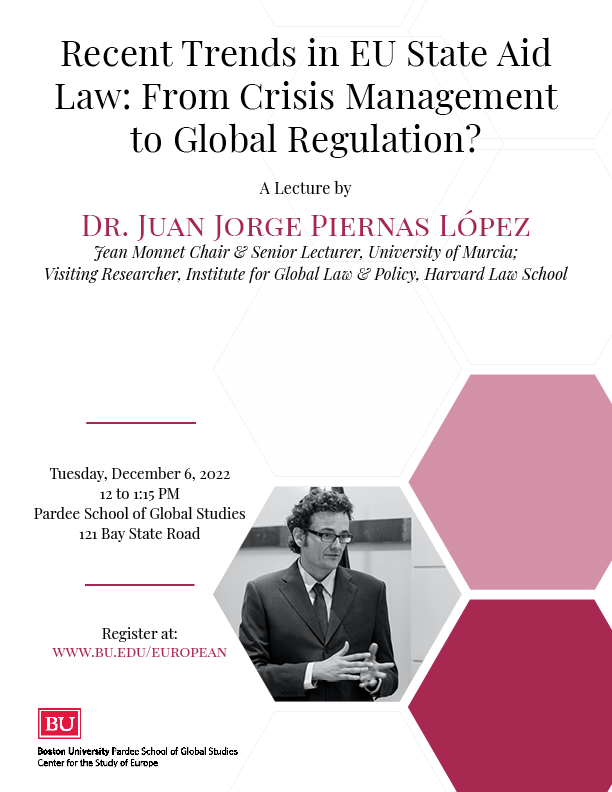 Join us for a lunch talk by Dr. Juan Jorge Piernas López, Jean Monnet Chair & Senior Lecturer at the University of Murcia and a Visiting Researcher at the Institute for Global Law & Policy at Harvard Law School: Recent Trends in EU State Aid Law: From Crisis Management to Global Regulation?