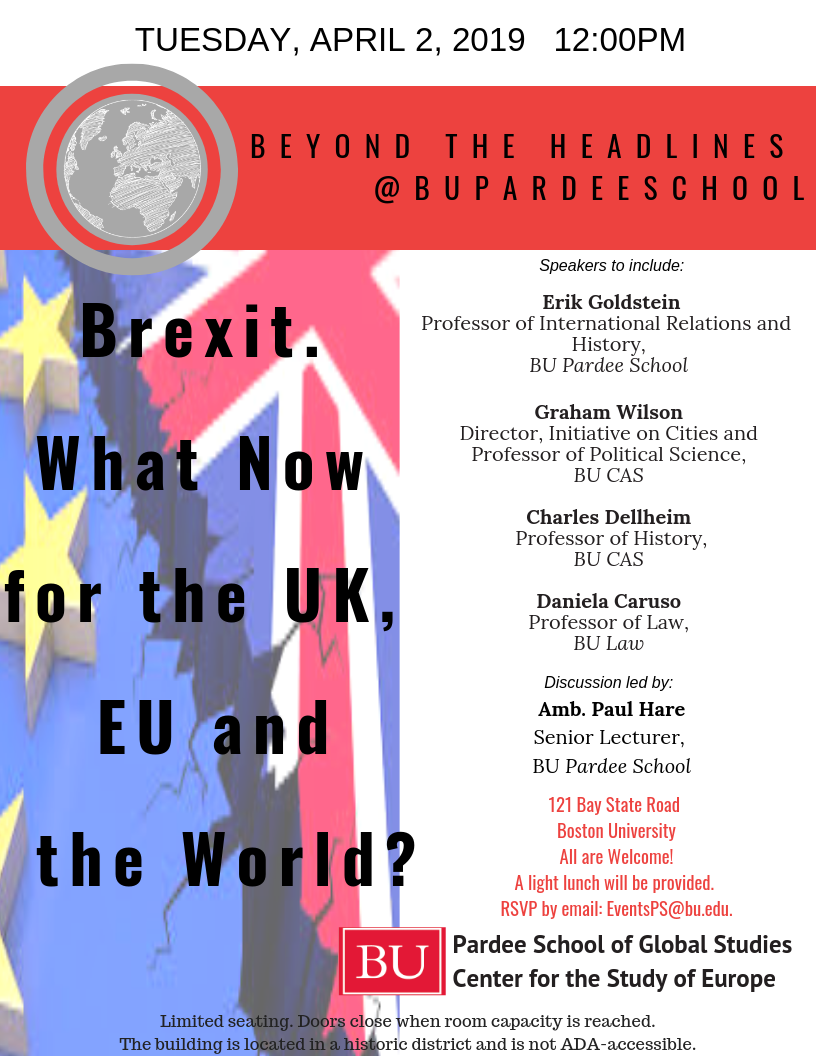 Our Beyond the Headlines series continues with a discussion entitled "Brexit. What Now For the UK, EU and the World?" The panel will feature Pardee School Professor of International Relations and History Erik Goldstein, Professor of Political Science and Director of the BU Initiative on Cities Graham Wilson, Professor of History Charles Delheim, and Professor of Law Daniela Caruso. The discussion will be led by Pardee School Senior Lecture Amb. Paul Hare.