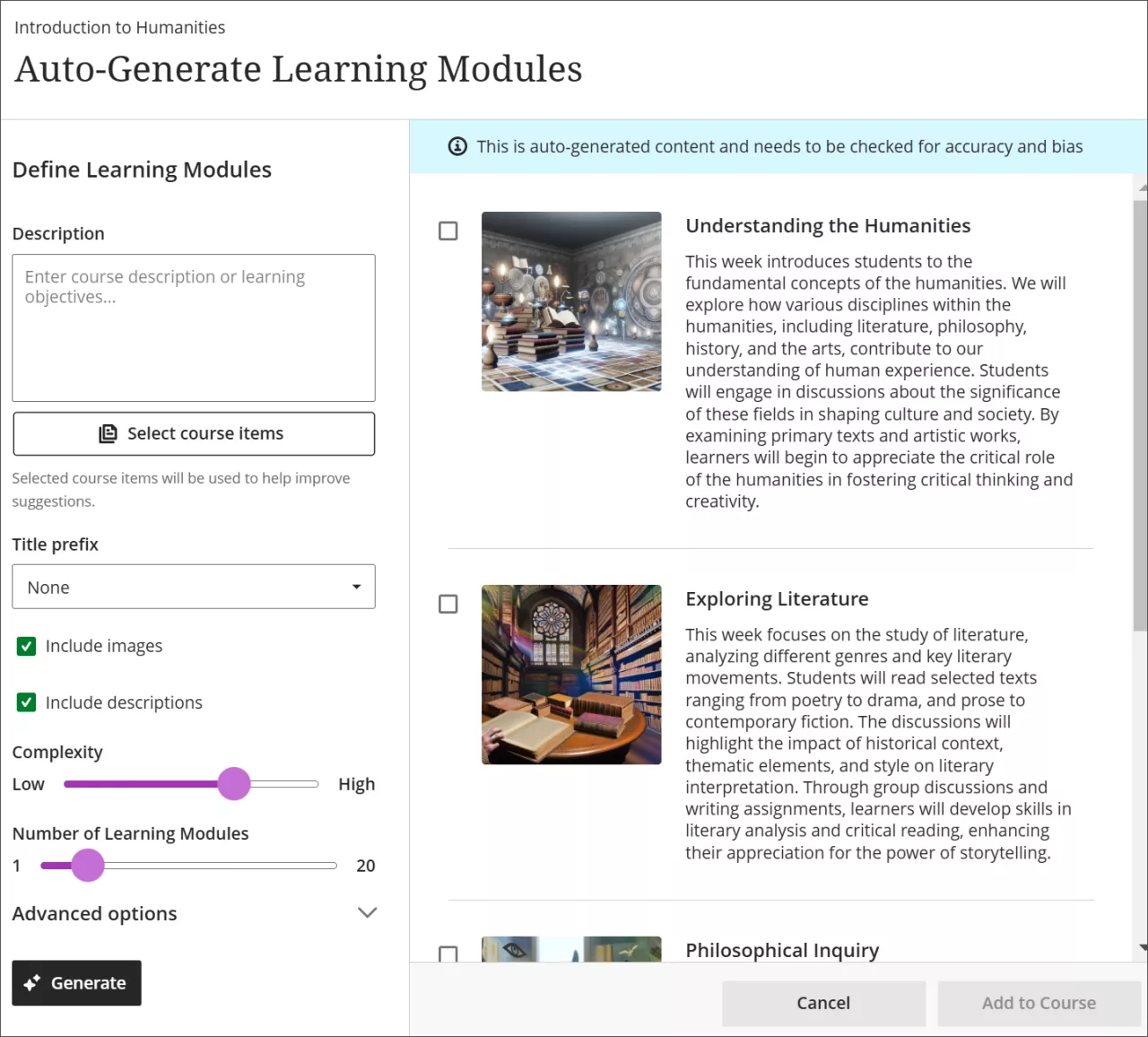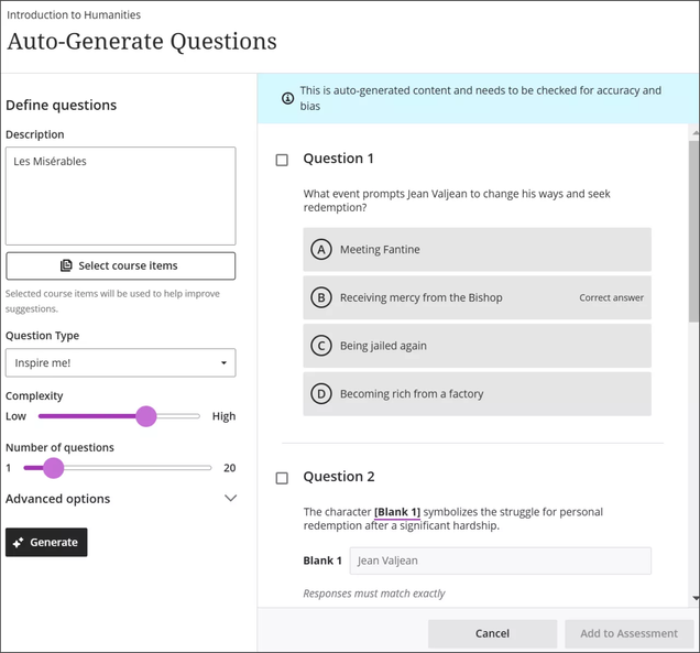 Includes an AI Design Assistant that helps generate assignments, rubrics, test questions, and content suggestions. See our AI Design Assistant Key Feature page for more information.