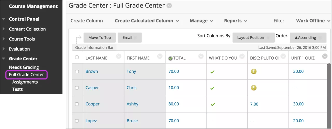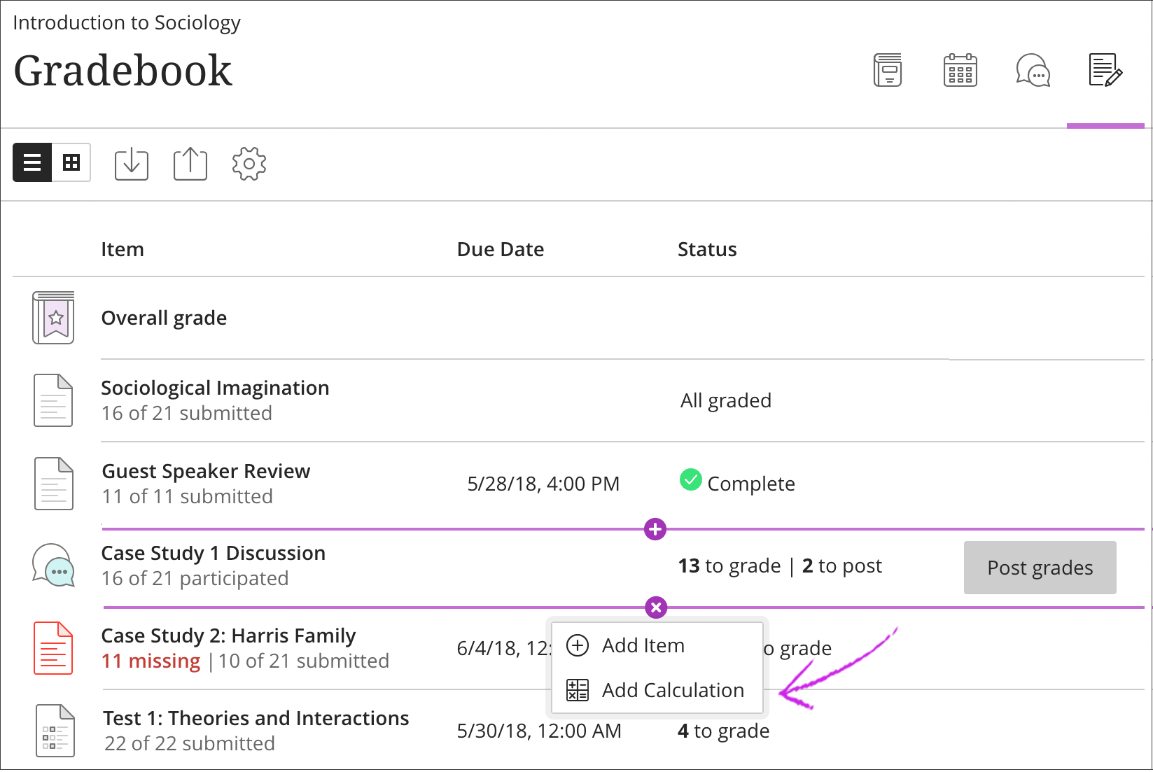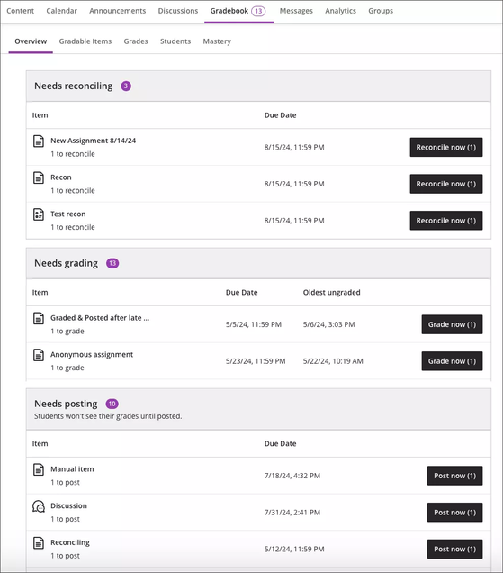 Multiple grade book views offered, empowering faculty to use the view the best suits their needs. Instructors can easily toggle between an overview of items that need grading, student progress, and posted grades. The interface is streamlined for efficiency and clarity.