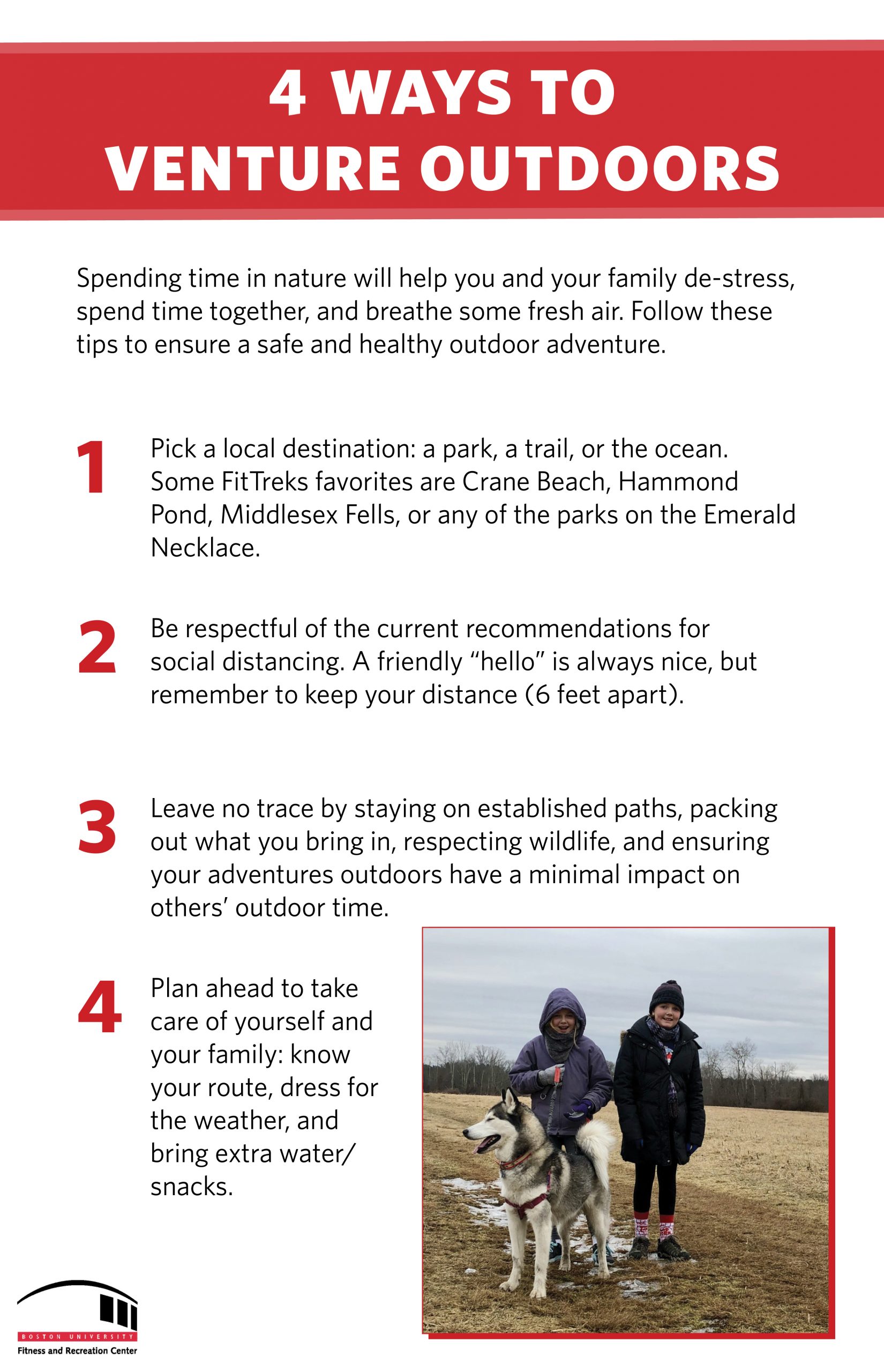 4 Ways to Venture Outdoors Spring has sprung and warmer weather is upon us! Getting outside is a great way to destress, take a break from studying, or go for a movement break. Check out these few simple tips for ways to spend time outdoors.