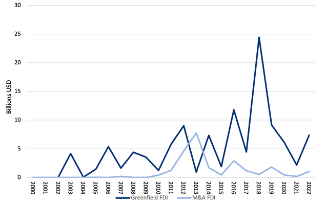 Figure 11: Trend in China’s Greenfield and M&A FDI to Africa, 2000-2022