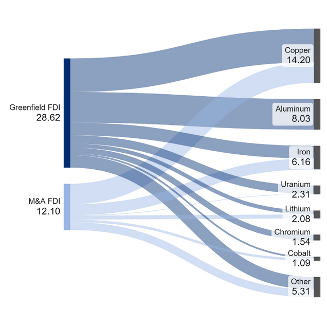 - The majority of both greenfield and M&A FDI for energy ventures supported fossil fuel projects (oil and gas/LNG), while greenfield FDI supported renewable energy at a higher percentage (8 percent) than DFI loans. FDI to copper, alumina and iron ore largely dominated, showing the involvement of Chinese companies in all stages of the metals and minerals supply chain in Africa. Chinese FDI primarily targets the exploration and extraction of these energy sources and transition materials.