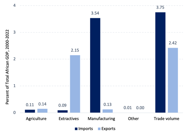 - Between 2021-2022, African exports to China increased by 19 percent. China’s exports to Africa grew by 11 percent over the same period, but since China’s export value to Africa remained higher than Africa’s exports to China, a trade deficit of 2.6 percent of GDP persisted by the end of 2022.