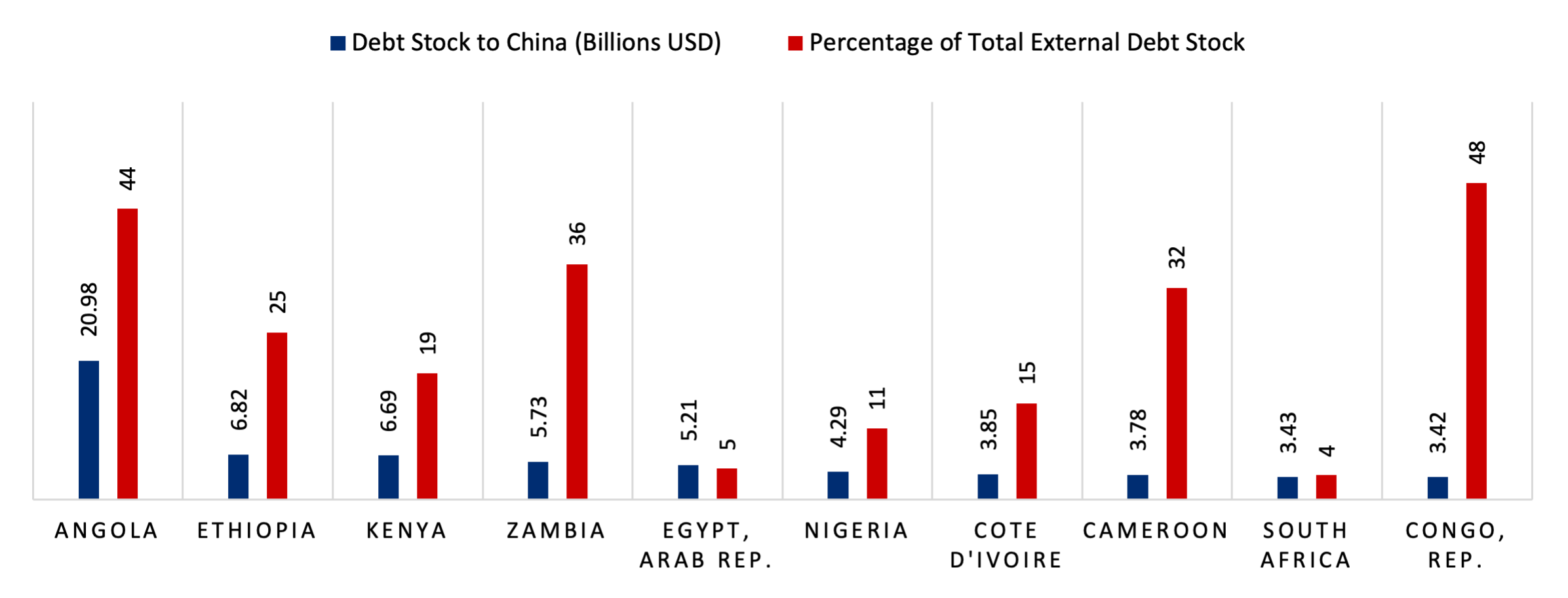 - In 2022, Africa’s debt to China was 13 percent of Africa’s external debt, which was roughly the same as debt owed to the World Bank and under the 28 percent owed to bondholders. China’s largest debtors in Africa were Angola ($20.98 billion), Ethiopia ($6.82 billion), Kenya ($6.69 billion), Zambia ($5.73 billion) and Egypt ($5.21 billion). Though Angola and Kenya narrowly avoided default recently and look well poised to refinance existing debt, the three African countries that defaulted in the last three years, Zambia, Ghana and Ethiopia, were all among China’s top 10 borrowers in Africa.