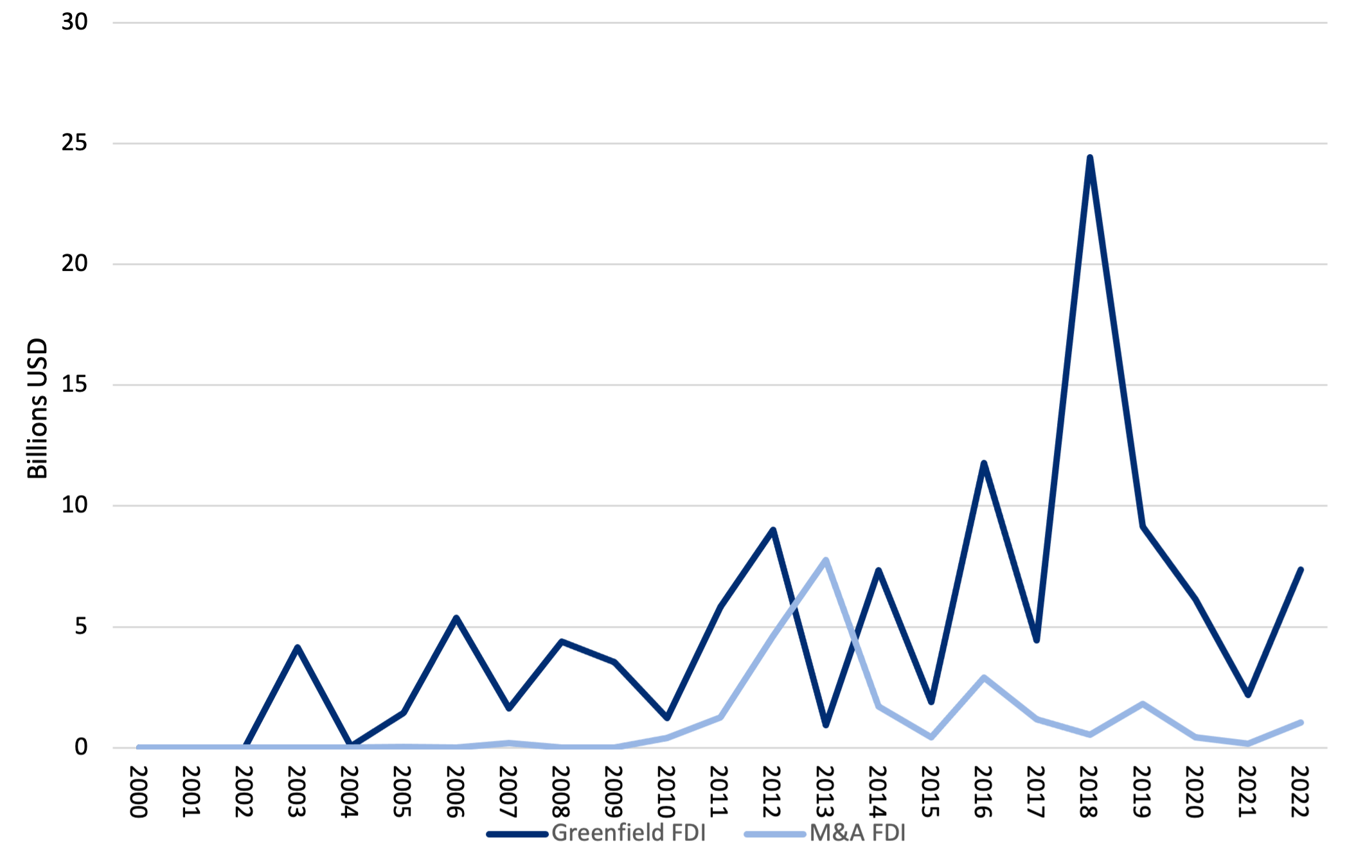 - From 2000-2022, Chinese companies announced $112.34 billion in greenfield FDI and completed $24.60 billion in mergers and acquisitions (M&A) FDI deals for projects and ventures across Africa. Greenfield FDI was directed mainly toward industry and trade/services, energy and non-energy mining and processing sectors. M&A FDI was mainly distributed across non-energy mining and processing and energy sectors.