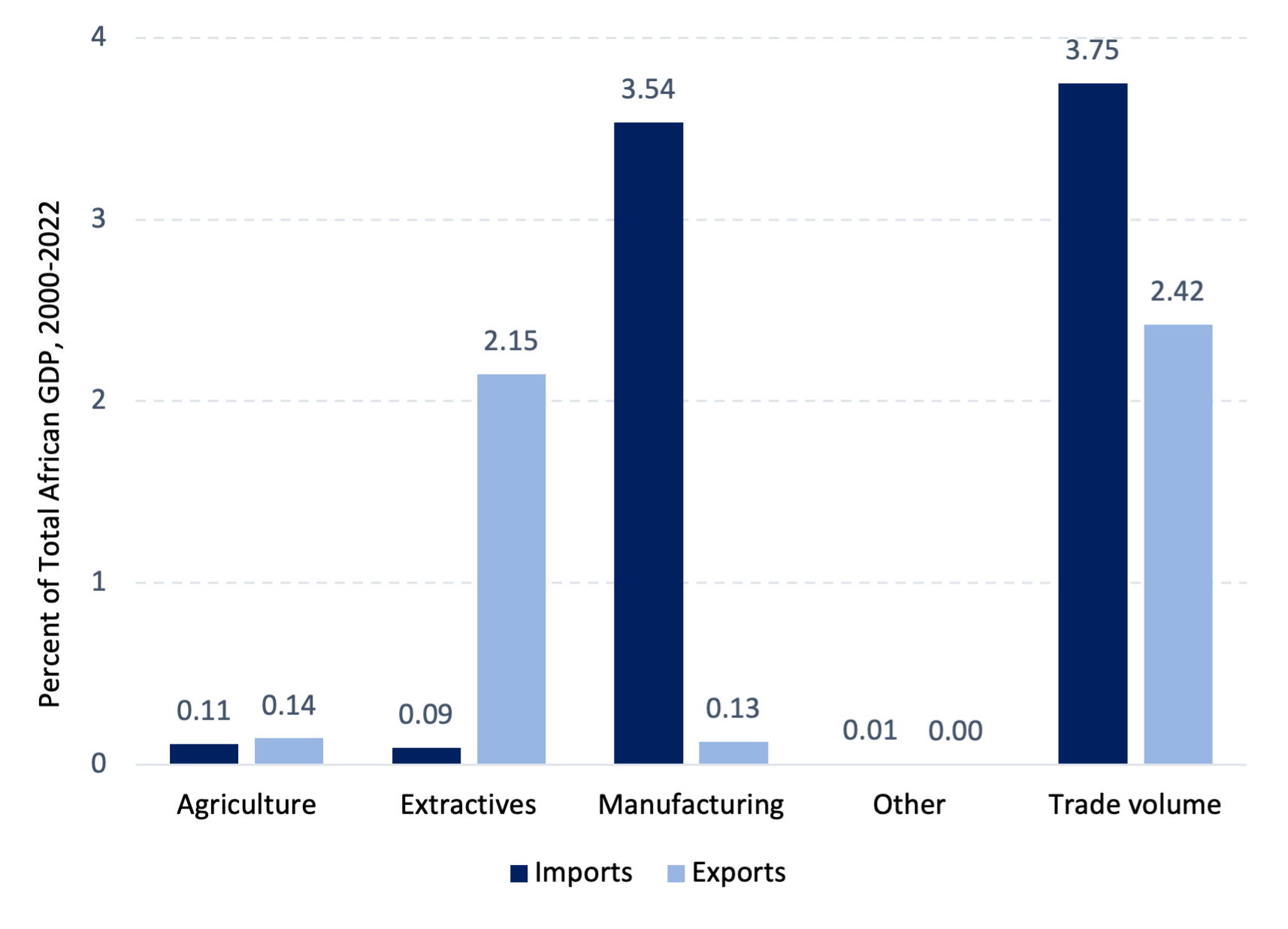- Africa-China trade is largely an exchange of primary commodities for finished goods. From 2000-2022, 89 percent of Africa’s exports to China were in the extractives sector and were mostly oil, copper, iron ore and alumina commodities. Imports on the other hand, were dominated by manufactured goods, such as telecommunications equipment and fabrics, which represent 94 percent of all imports from China during the same period.
