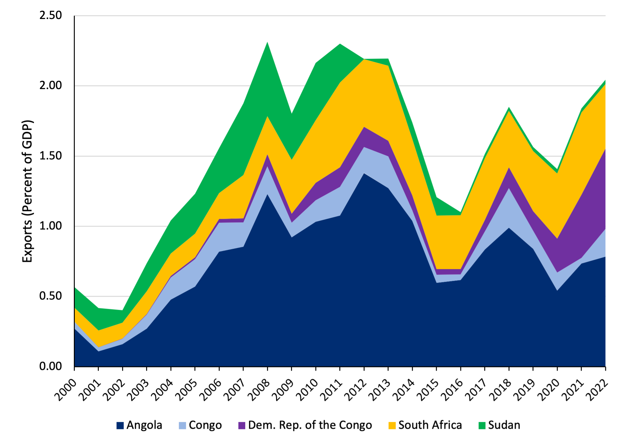 - In terms of exporting to China by country from 2000-2022, Angola leads through supply of crude oil primarily, followed by South Africa mostly by way of iron ore exports. The next three highest exporters, Sudan, Democratic Republic of Congo and Congo have mainly exported crude oil, copper and crude oil, respectively. Together, exports from these countries alone amounted to about 2 percent of Africa’s GDP in 2022 and 69 percent of total export value from 2000-2022.