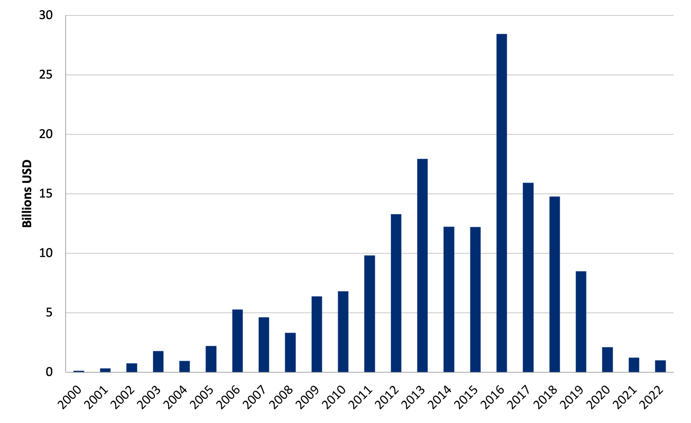 Figure 15: Chinese FDI for Non-energy Mining and Processing in Africa by Metal or Mineral in Billions USD, 2000-2022